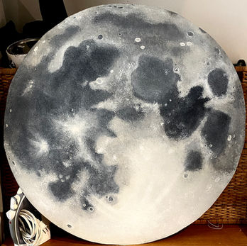 J’ai réalisé quatre lunes en différentes phases, peintes sur des cercles de contreplaqué de 2 pieds, destinées à la suspension décorative. Pour respecter la précision de la référence, j’ai utilisé la technique du quadrillage, des glacis successifs, ainsi que des effets texturés à l’éponge et des éclaboussures pour renforcer profondeur et réalisme.